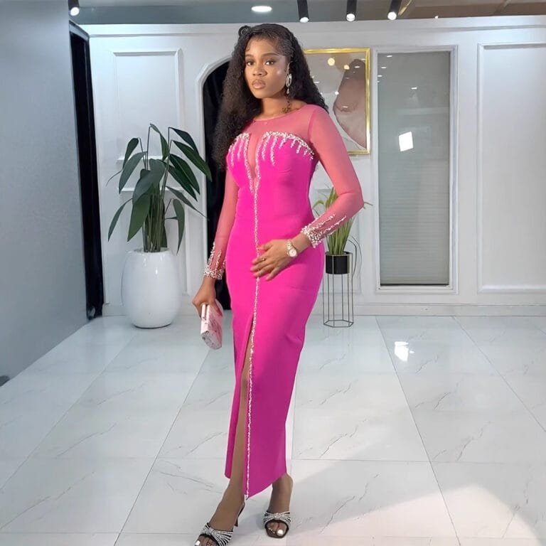 Hot Drilling See-Through Patchwork Slit Dress – Elegant Pink